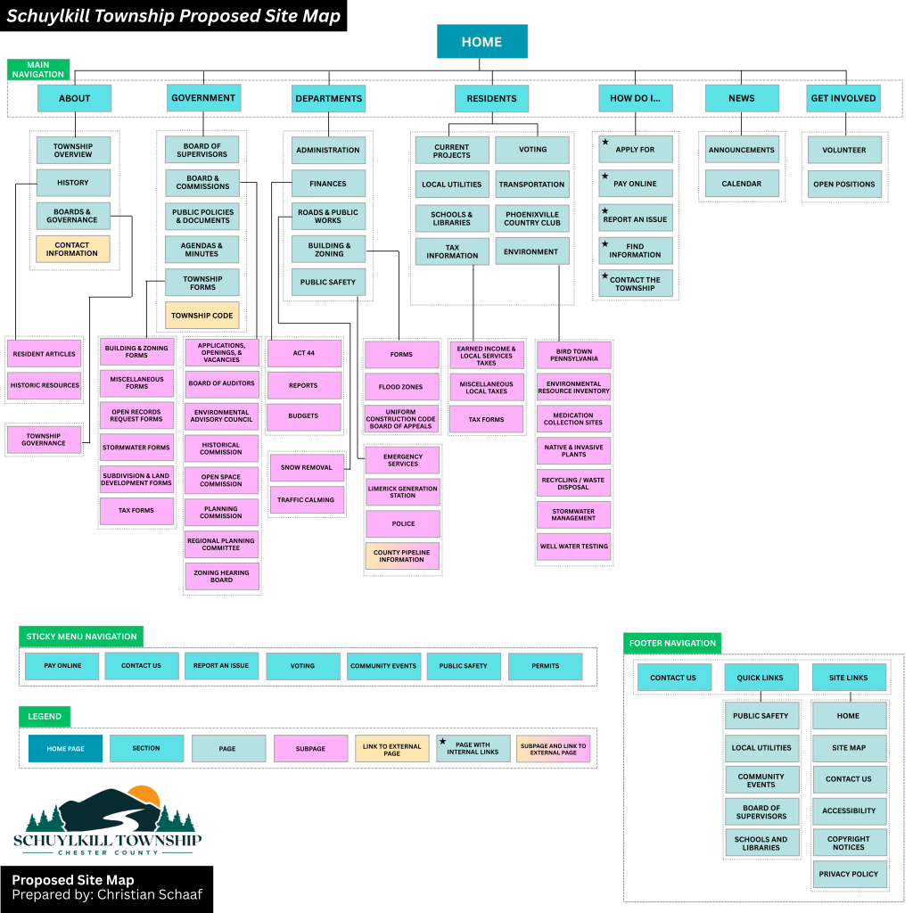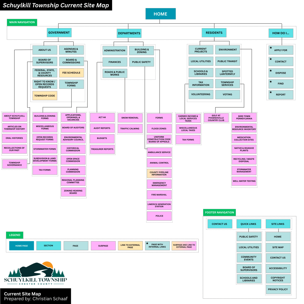 With this knowledge in mind, I analyzed the information architecture of my own township’s website – Schuylkill Township. My goal? To evaluate the current structure, identify areas of improvement, and propose a new, streamlined site map.