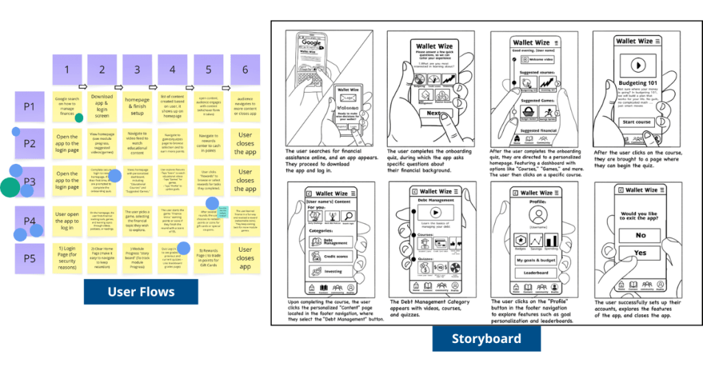 2. Decide + Storyboard: We used a series of voting techniques to narrow down our best ideas. From these, we created user flows and a storyboard.