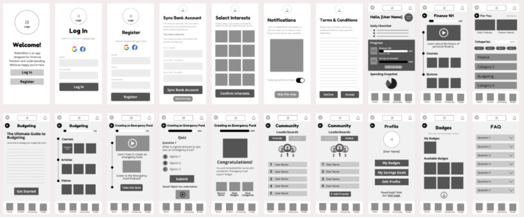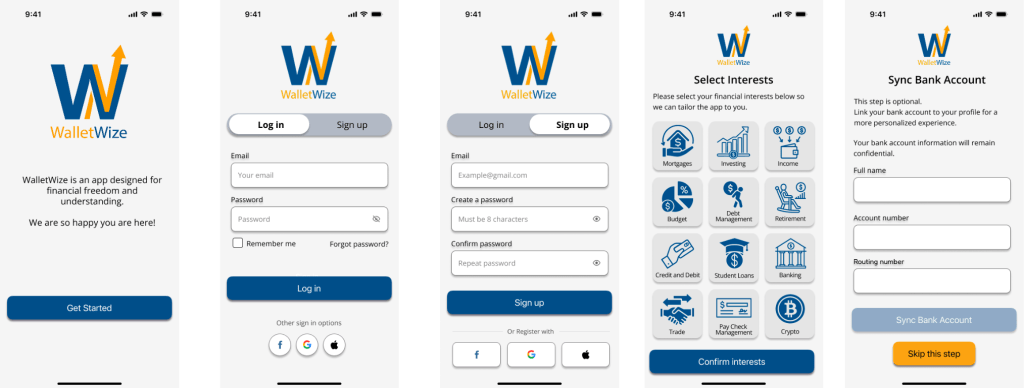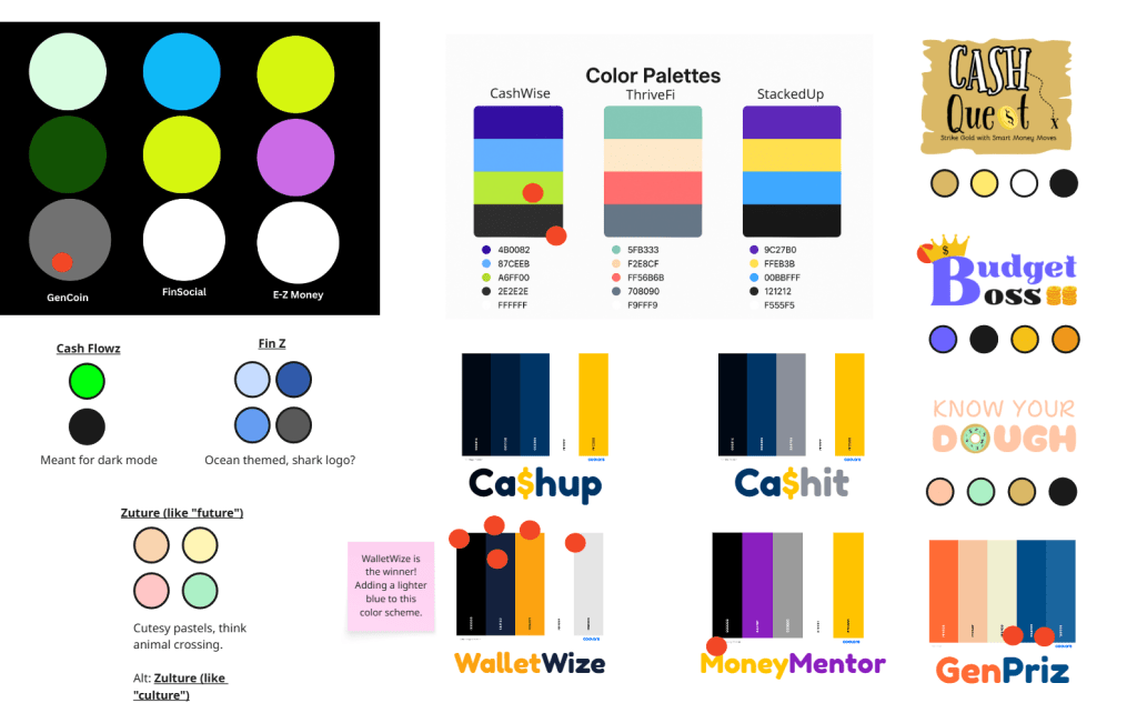 We began by naming the app and selecting a color scheme through voting with red dots. We chose “WalletWize” as our final name and adjusted our palette to include a bold royal blue and bright orange to appeal to Gen Z.