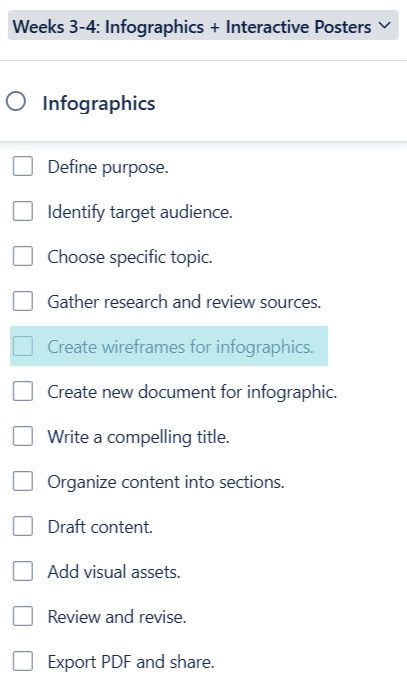 Starting your deliverables can feel overwhelming, but here’s the good news: you’ve already laid the groundwork. If you created a detailed project management plan, you’ve already mapped out what you need to do. That’s exactly what helped me when I began creating my infographics this week. I returned to my Trello board, looked at the tasks under “Week 3,” and followed them step by step: conduct research, outline content, and design the drafts.