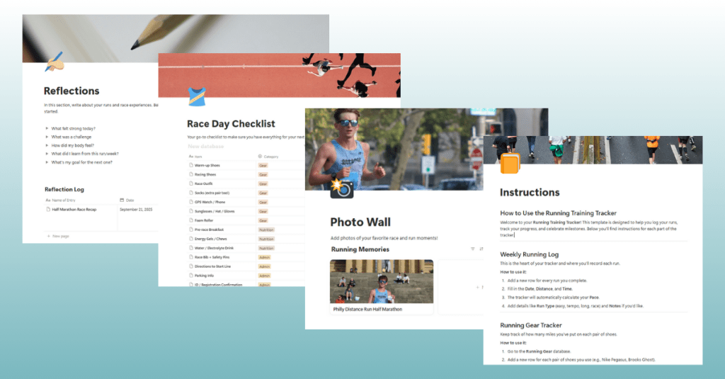 I also built out pages for Reflections, a Photo Wall, a Race Day Checklist, and a detailed Instructions guide. Each page uses inline tables with properties like Name, Date, and Notes to keep the setup simple and flexible.