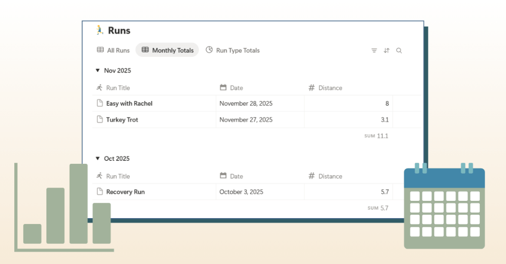Another big focus was implementing the last suggestions from user testers. The most significant one was a feature to track monthly mileage totals. My first instinct was to build a new table, but after experimenting, I realized I could create a new view within the existing running log. This kept everything in one place and made the layout cleaner.
